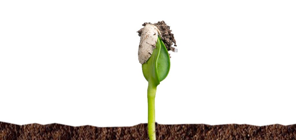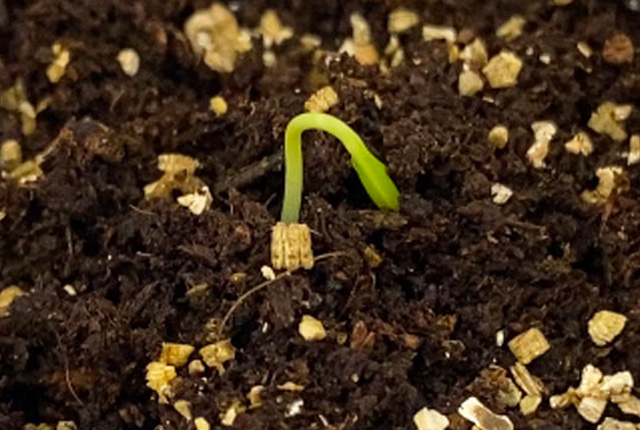In questa fase della germinazione in semenzaio la piantina sta per uscire da l terriccio per la semina.
