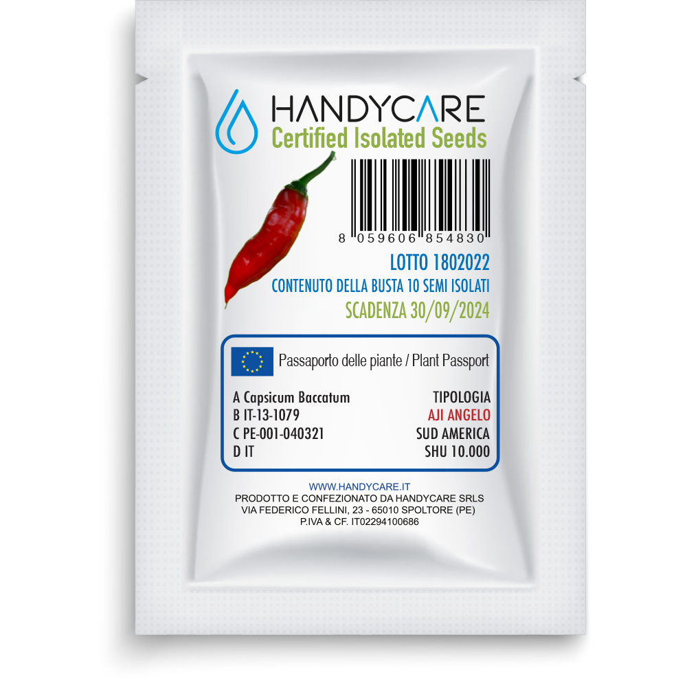 Il peperoncino AJI ANGELO è un peperoncino appartenente alla varietà dei Capsicum Baccatum, originaria del Sud America, la specie ha un patrimonio genetico a 24 cromosomi. La pianta è caratterizzata da una notevole l’altezza, tipica della specie ed un’elevata produttività. La spiccata tendenza a crescere molto in altezza prima di biforcare è evidente fin da subito. Nella piantina sono presenti foglie di dimensioni notevoli, soprattutto nella fase vegetativa pura e durante la crescita indoor, con la messa a dimora all’esterno questa caratteristica si va via via perdendo. La pianta è di notevoli dimensioni, imponente e maestosa, alta circa 140-180 cm e larga 40-60 cm, tende ad assumere una forma ad alberello eretto, molto composto ed ordinato in quanto non presenta getti laterali che partono dal basso e la biforcazione avviene ad almeno 60 cm dal livello del terreno. I rami sono lunghi, sottili e flessibili, si dirigono verso l’alto ed hanno la stessa colorazione del fusto.