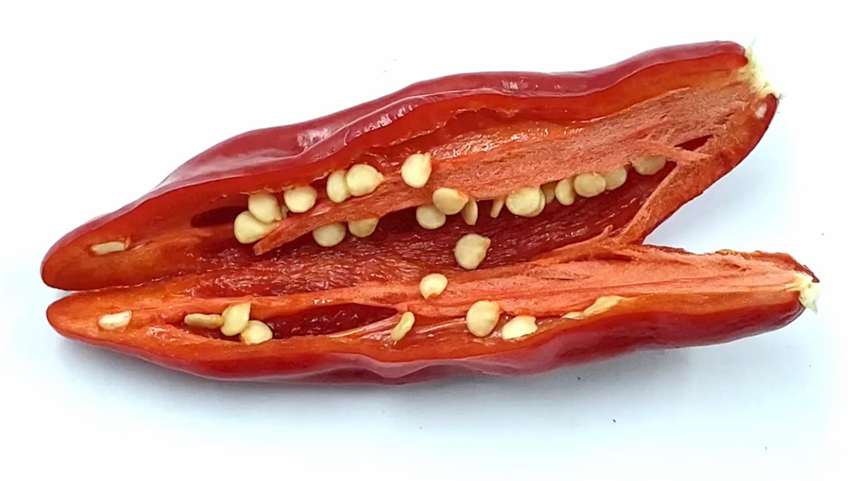 La dimensione massima dei frutti è di circa 6-9 cm di lunghezza e 1-2 cm di larghezza. Il frutto appena allegato è di colore verde e matura virando sul rosso acceso. L’interno del frutto presenta 2 loculi che contengono i semi, non meno di 20 per frutto, raggruppati perlopiù alla base del frutto. La placenta è presente per tutta la lunghezza del frutto, di colore giallo, è poco carnosa e non riveste le pareti interne del frutto. Matura in circa 40-45 giorni dall’allegagione. SHU 10.000