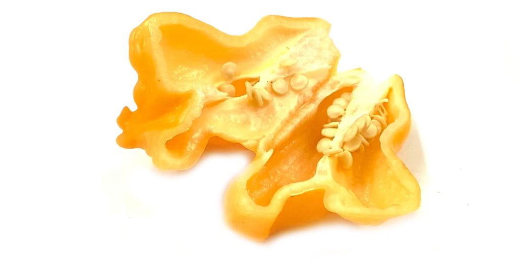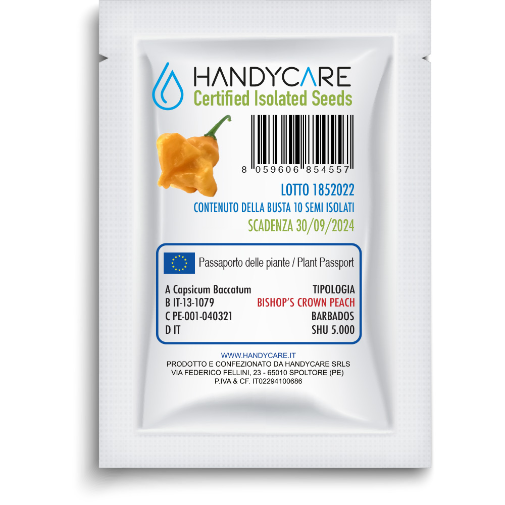 Il Bishop’s Crown Peach è una delle varietà di peperoncini appartenenti alla categoria delle “capsicum baccatum”, Il Bishop’s Crown è una varietà che appartiene alla specie Capsicum baccatum. Trattasi di una pianta originaria delle Isole Barbados con una produttività eccellente. I peperoncini, profumati e saporiti, assumono la caratteristica forma di un “cappello del vescovo” da cui prendono il nome. La piccantezza è bassa e può stimarsi ragionevolmente in un range di 500 / 5.000 SHU tale da renderlo una delle varietà più adatte e gradite per chi si approccia per la prima volta al mondo del piccante. La pianta, soprattutto se messa a dimora in piena terra, può raggiungere i due metri di altezza e 1- 1,5 metri di larghezza con abbondanti raccolti. SHU 5.000