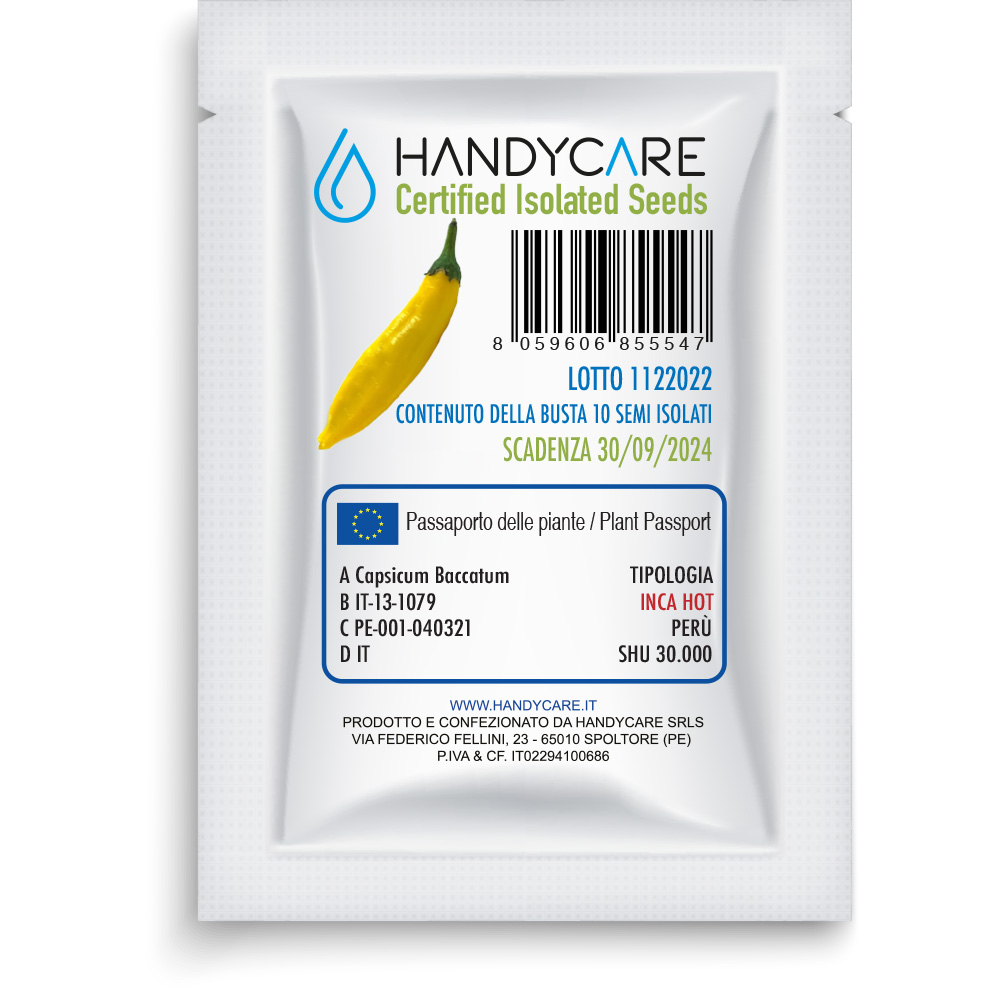 Il peperoncino INCA HOT è un peperoncino appartenente alla varietà dei Capsicum Baccatum, molto simile ad un classico di questa specie, aji Lemon, da cui differisce solo per una più accentuata piccantezza ed un aroma più erbaceo. La pianta ha portamento a cespuglio, può raggiungere notevoli dimensioni ed è estremamente produttiva. Le foglie sono di forma ovata e presentano una leggera pubescenza. I fiori, a volte multipli per nodo, sono eretti e presentano dei fantastici spot verde chiaro tipici della specie.I frutti, di forma allungata ed irregolare, nascono verdi ed eretti per poi divenire penduli poco prima di iniziare la maturazione che si completa in un color giallo acceso. Non sono però rari frutti con portamento difforme da quello sopra descritto. L’escarpo è liscio ed il mesocarpo molto sottile ed asciutto. Il frutto è croccante e rilascia quando aperto uno spiccato aroma tipico dei c. baccatum. La crescita della pianta è abbastanza veloce ma la produzione è tardiva anche a causa del molto tempo necessario dalla nascita dei frutti alla formazione e maturazione. SHU 30.000