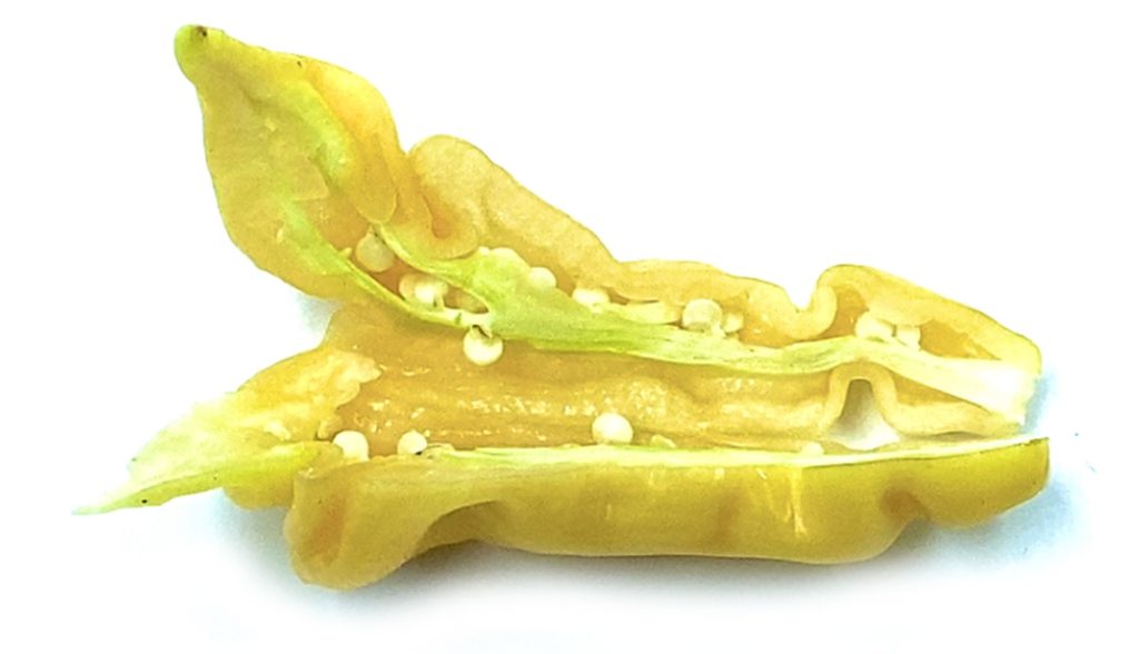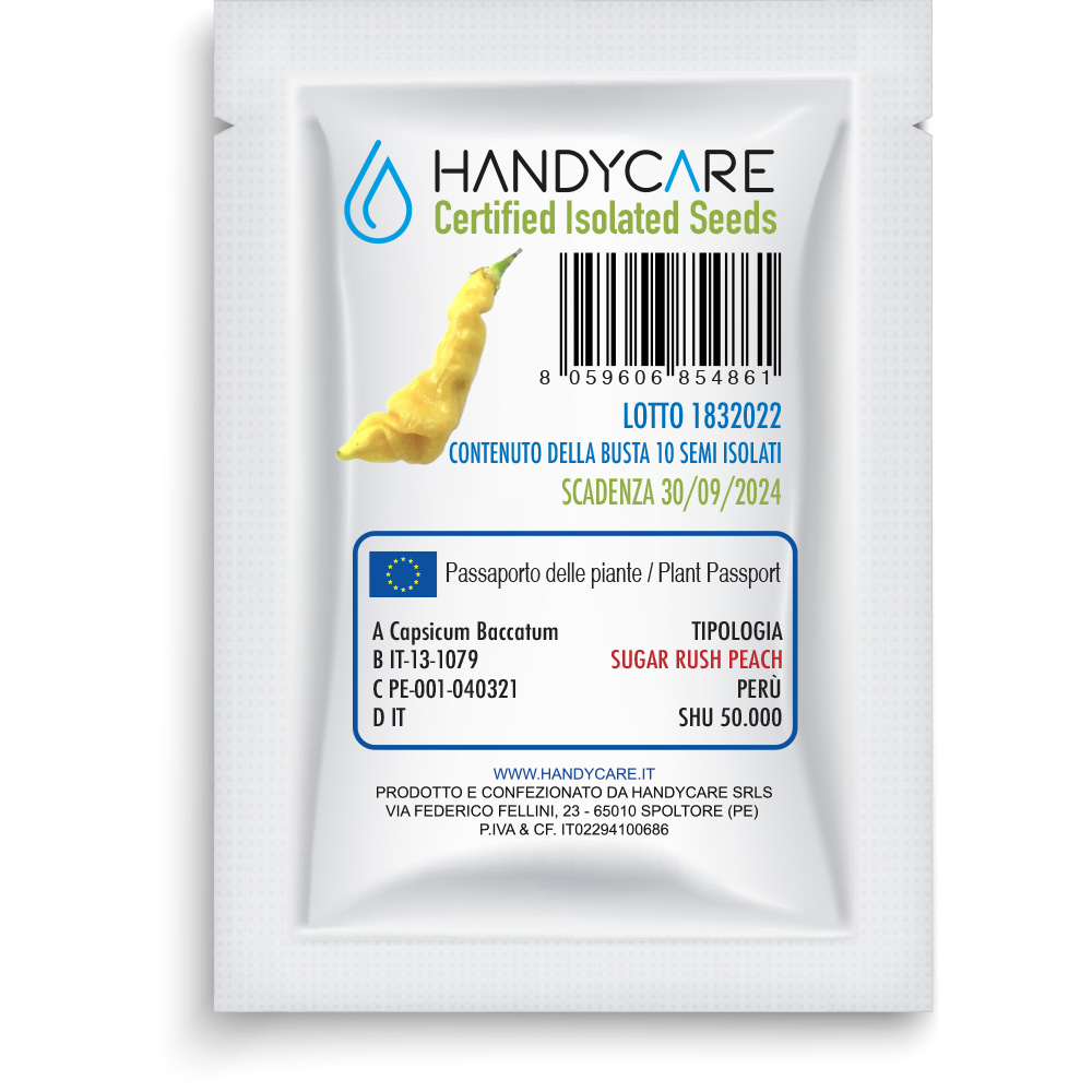 Il peperoncino SUGAR RUSH PEACH è un peperoncino appartenente alla varietà dei Capsicum Baccatum, ha origini in Perù e coltivati in tutto il Sud America e Costa Rica.Il Sugar Rush Peach è un peperoncino facile da coltivare, hanno un sapore dolce e le piante crescono rapidamente. Frutti grandi e oblunghi, con una superficie rugosa e un’estremità appuntita. Il colore inizia verde chiaro o giallo, trasformandosi in un cremoso color pesca a maturazione completa. Le piante possono raggiungere 120 cm di altezza se esposte al pieno sole. Il sapore del Sugar Rush Peach è, ovviamente dolce. Ha anche un sapore tropicale se consumato fresco. Ingrediente perfetto per una salsa o condimento nelle frittate. SHU 50.000