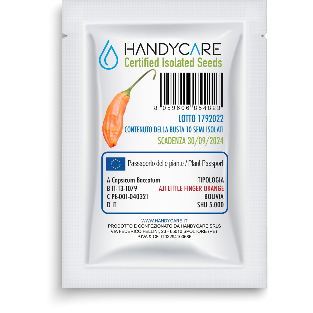 l peperoncino LITTLE FINGER ORANGE è un peperoncino appartenente alla varietà dei Capsicum Baccatum. (in Sud America è spesso chiamato anche Aji) e, come è tipico per questa specie, è una pianta a crescita molto rapidamente. Se preferisci una crescita più folta, dovresti tagliare i germogli superiori in una fase iniziale. Le piante tollerano meglio il nostro clima rispetto alle varietà di peperoncino tropicale. Livello medio di piccantezza. Per il loro sapore fruttato sono adatti per salse e creme, e sono buoni anche essiccati. La temperatura di germinazione è compresa tra 20 e 28°C (periodo di germinazione di 7 – 20 giorni), pertanto si consiglia l’uso di una serra e di un tappetino riscaldante. Le piante necessitano di terreno fresco, ben concimato, permeabile e non tollerano ristagni d’acqua. Dovrebbero essere piantati in un luogo soleggiato e protetto con almeno 6 ore di luce solare, preferibilmente di più. SHU 5.000